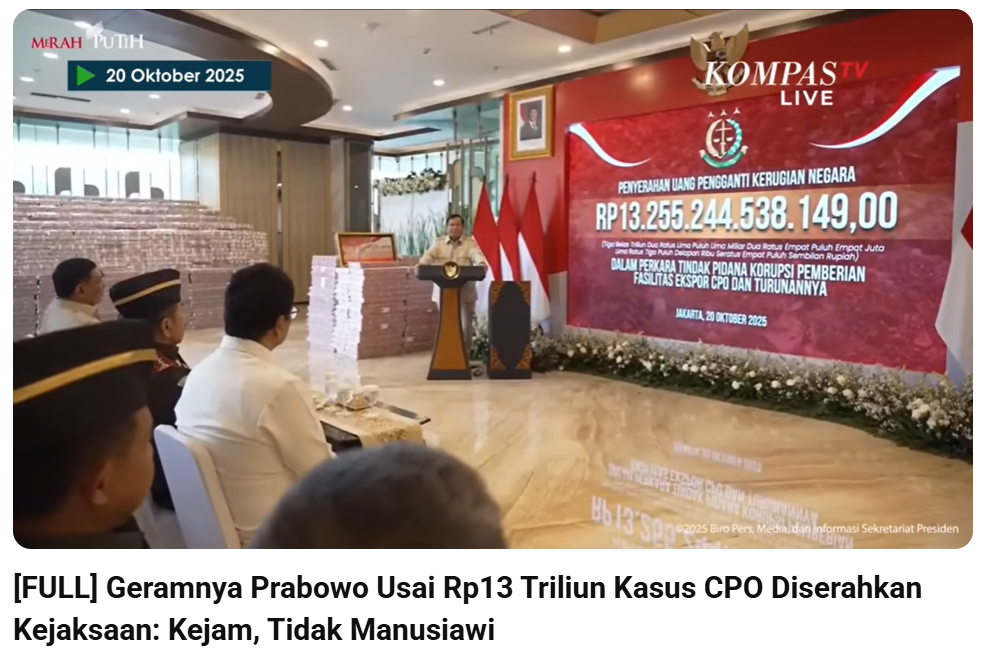 KOMPAS.TV menyiarkan secara langsung – Presiden Prabowo menyaksikan Kejaksaan Agung penyerahan Rp13 triliun uang pengganti kerugian negara dalam kasus ekspor CPO kepada Menteri Keuangan RI pada Senin (20/10/2025). Usai menyaksikan penyerahan uang itu, Presiden Prabowo Subianto menyampaikan pesan yang menilai kasus CPO sangat kejam dan tidak manusiawi. Presiden menilai kasus CPO dapat digolongkan ke dalam subversi ekonomi.