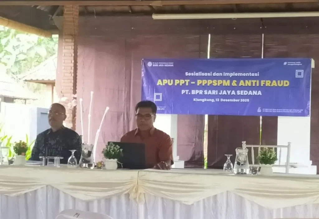 Klungkung — BPR Sari Jaya Sedana menggelar pelatihan internal bertema Sosialisasi dan Implementasi Penerapan Strategi Anti Fraud, APU PPT, dan PPPSPM pada Sabtu, 13 Desember 2025, di Kenyeri Garden & Shala, Semarapura Kauh, Klungkung.